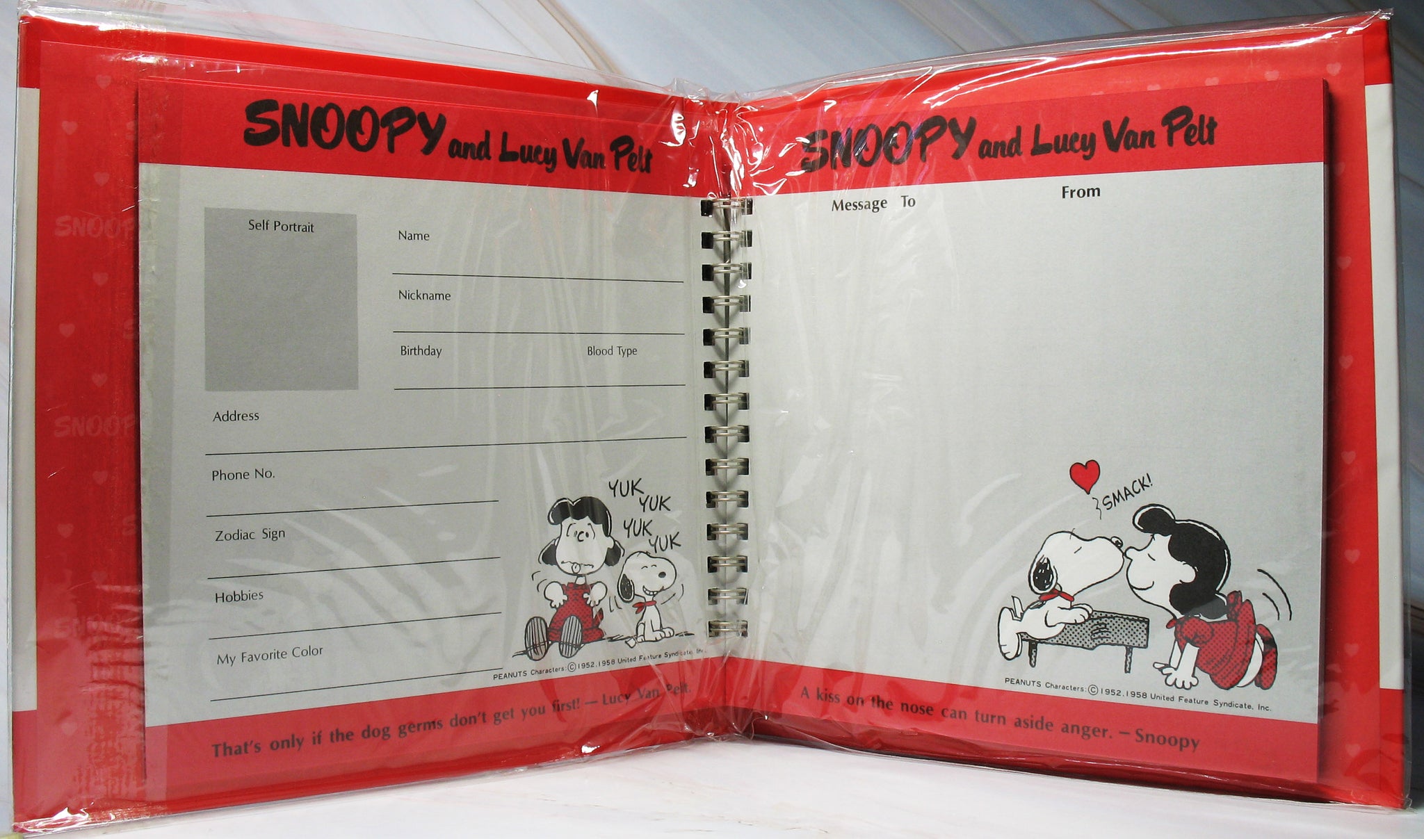 Rare Japanese Sample spiral-bound hardback address book. Japanese samples are prototype products made for various companies to evaluate before mass producing. Pages are decorated with Snoopy and Lucy graphics and a sentiment by both on each page. Features space for small photo, name, address, phone number, zodiac sign, hobbies, and favorite color. Plus each entry has a message page. Includes 50 double-sided pages. Measures 7.5" x 7.5" x .75" high - NEW