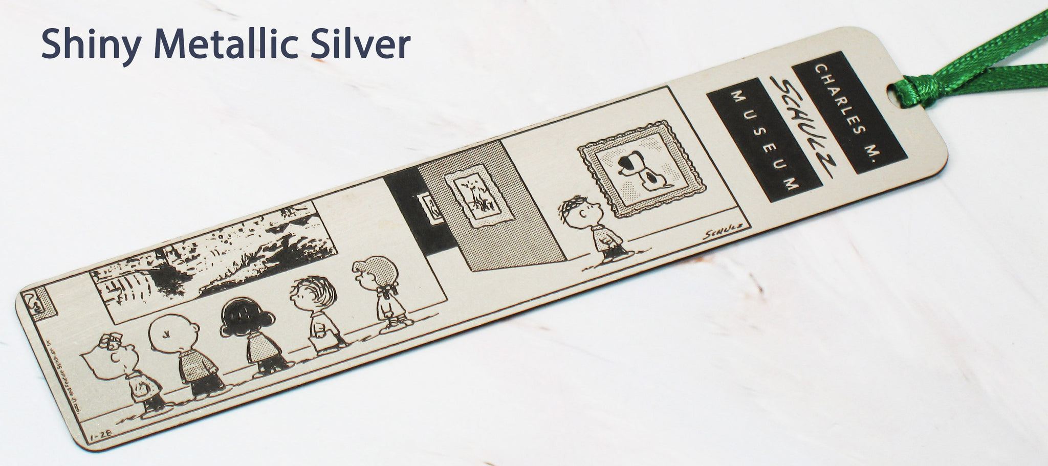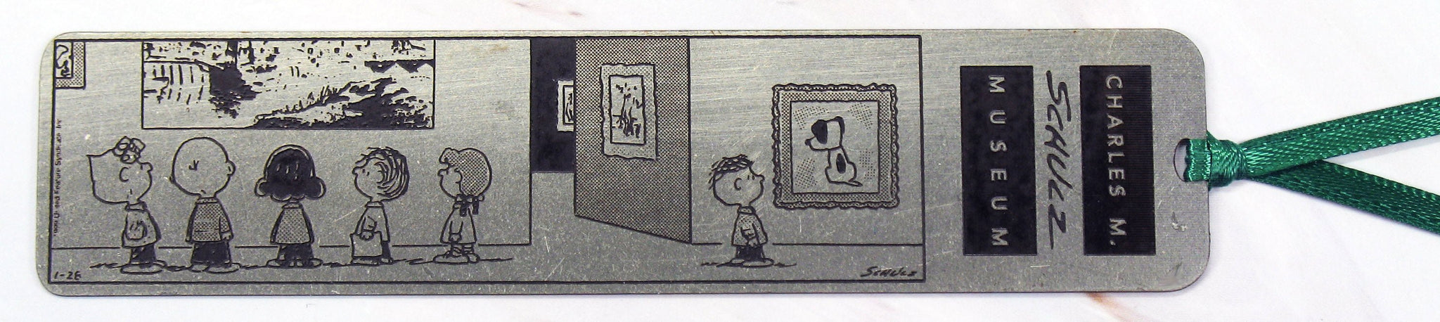 Charles Schulz Museum Metal Book Mark With Satin Ribbon Tassle. Shiny metallic silver finish - 1" x 4.5" - NEW