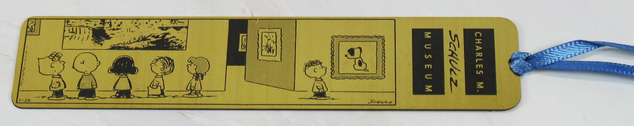 Charles Schulz Museum Metal Book Mark With Satin Ribbon Tassle. Shiny metallic brass finish - 1" x 4.5" - NEW