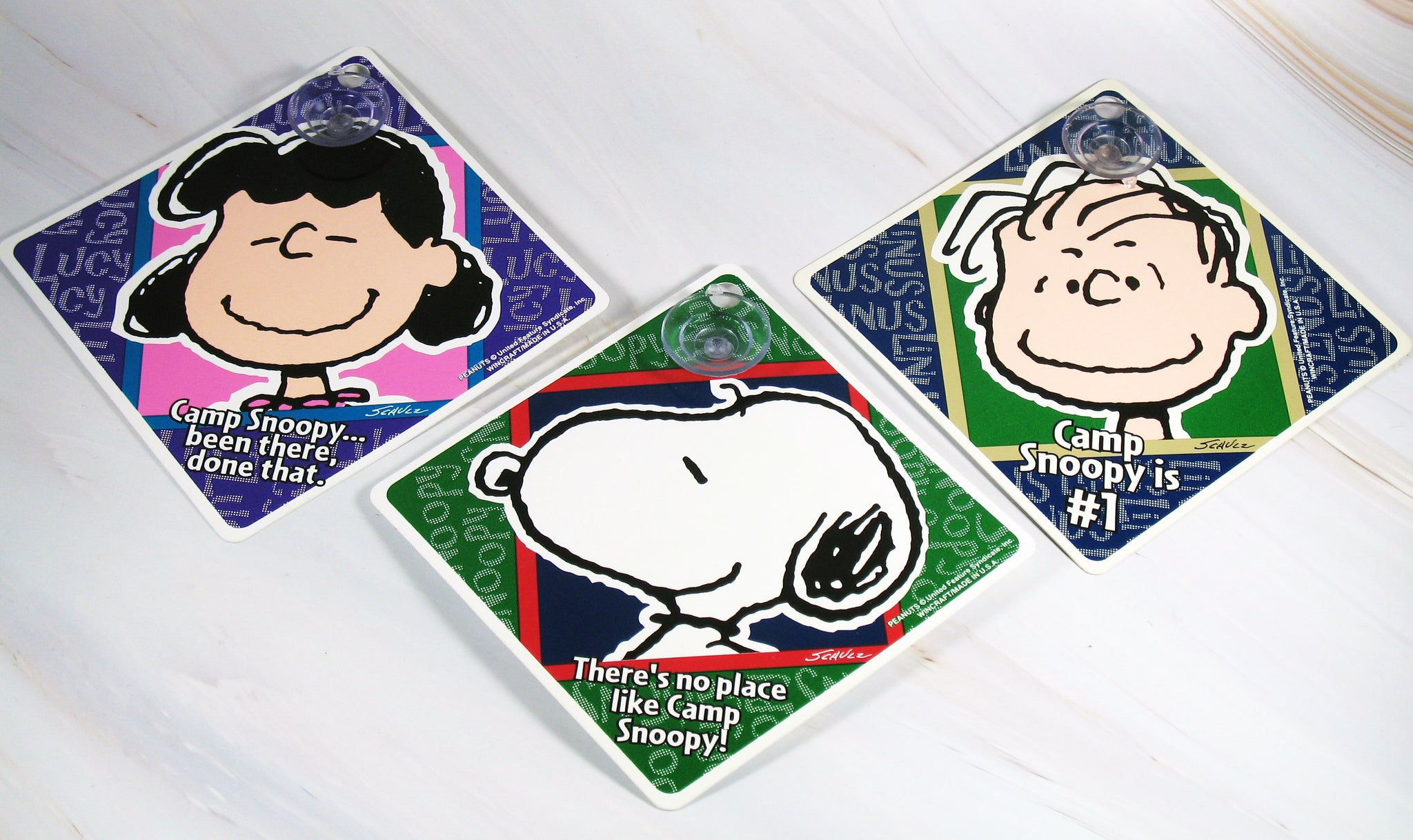 Camp Snoopy Plastic Window Decor With Suction Cup Hanger - 5" x 5" - NEW (3 Different Designs Available)