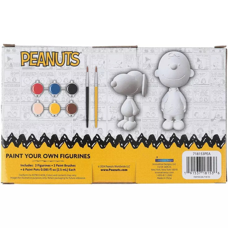 Craft your own Peanuts figures with the Paint-Your-Own Plaster Snoopy & Charlie Brown Kit! This kit features ready-to-paint plaster figures of Snoopy and Charlie Brown. Add colorful details using the included paint brushes and 6 paint pots, let them dry, then display them on a desk, shelf, or countertop. It's the perfect gift for artistic fans of Peanuts!