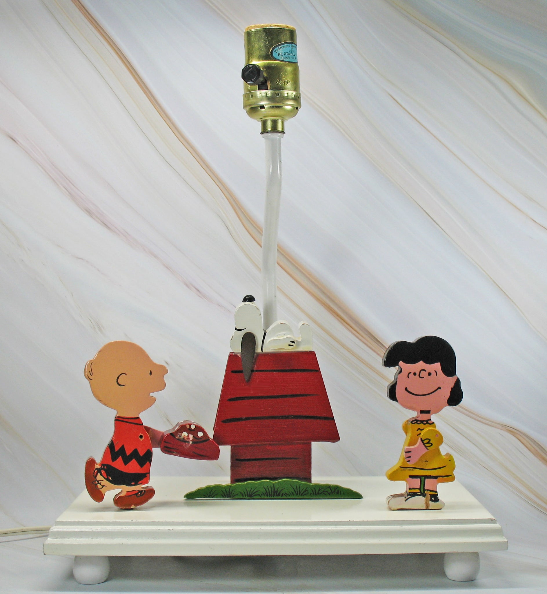 Very rare 1970's vintage combination lamp and night light on wood base. Features metal bent angle lamp support and hidden night light bulb in doghouse. Unique 3-way operating function: 1st turn of switch turns on night light only; 2nd turn of switch turns on lamp only; 3rd turn of switch turns on both lamp and night light. Measures 13" high at top of bulb holder; wood base measures 10" long x 5.5" wide/deep. GOOD CONDITION (Works well; missing shade support bracket and shade/can be found at hardware or lamp store; Charlie Brown missing outer arm and wobbly; Lucy missing inner arm and can be turned but not wobbly; small rough and raised area on side of dog dish Charlie Brown's holding/something (?) appears to be missing but not seen in any Peanuts guide books; Snoopy re-glued to doghouse at a slight lean; extremely light paint wear on base)