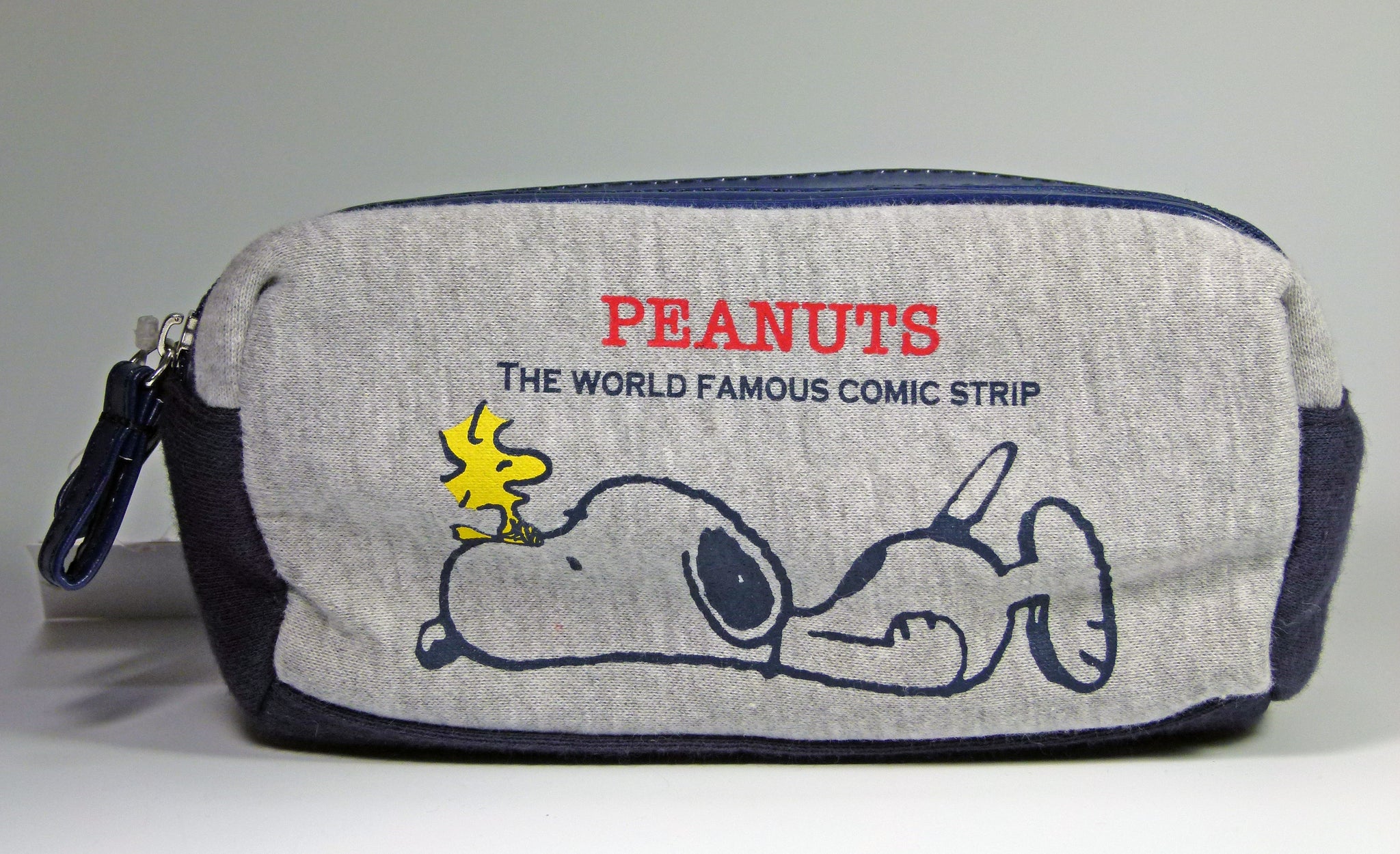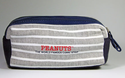 Snoopy double zipper/double compartments cloth cosmetics bag or clutch purse with washable nylon lining. Features full zipper double closures with contrasting vinyl trim down center. Measures 8" x 4.5" x 3" deep - NEW