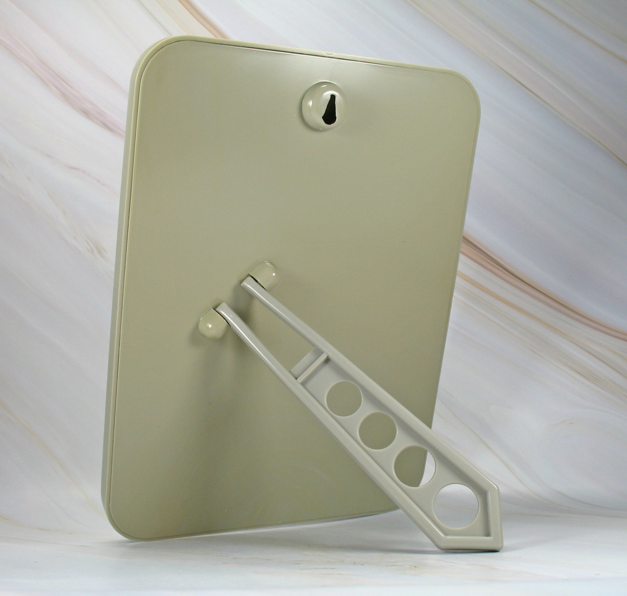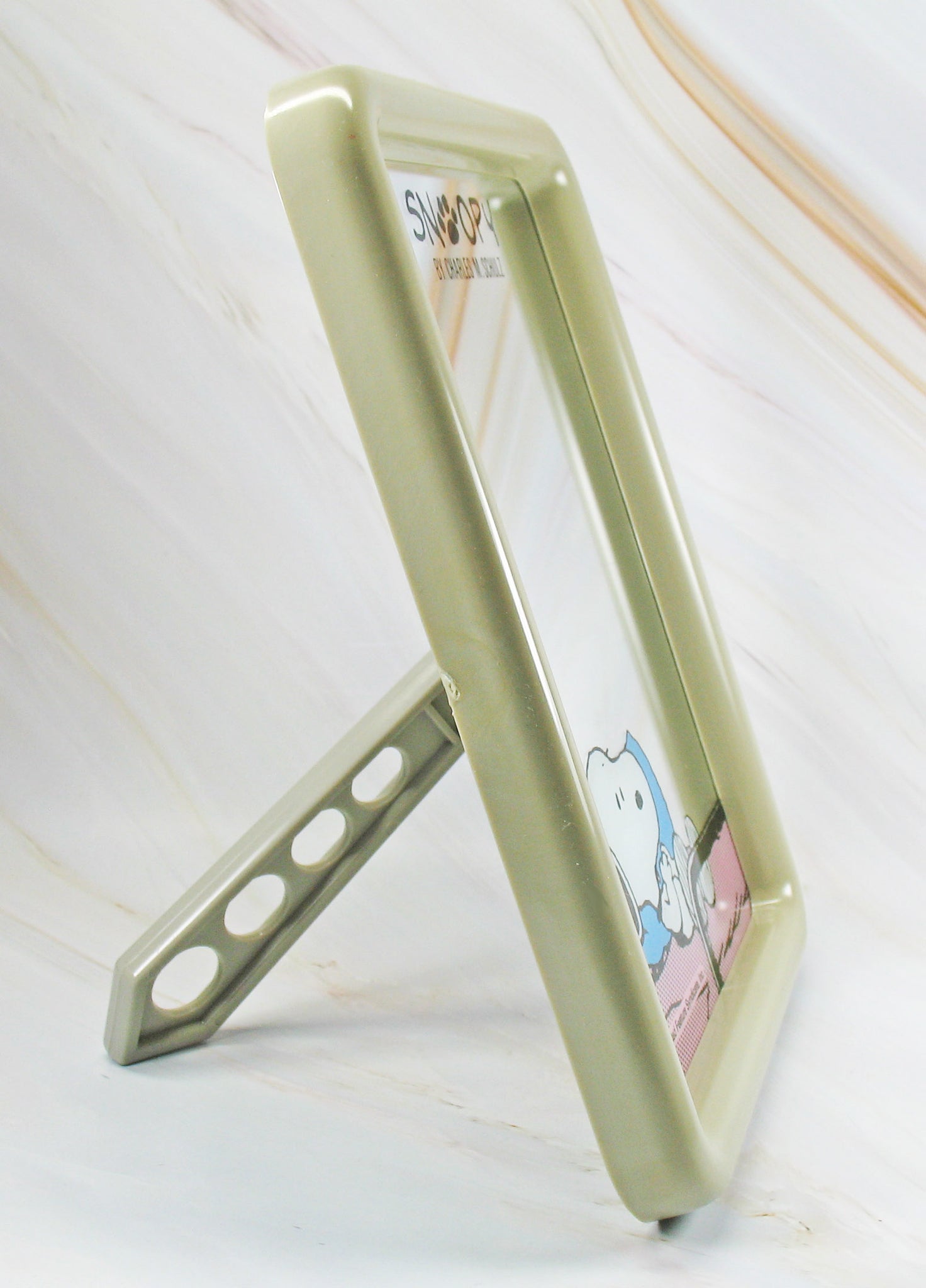 RARE Japanese Sample Snoopy sturdy melamine and glass table mirror. Japanese samples are prototype products made for various companies to evaluate before mass producing. Many samples are made for review but never mass produced, making them extremely rare. Opens to stand securely on table with support from back of case. Includes hole on back for hanging on wall. Photos taken from side due to reflective images showing on mirror and obscuring graphics. Measures 6" x 7 3/4" x 1/2" deep; 5.5" long support. NEW IN BOX (light box wear; writing on back)