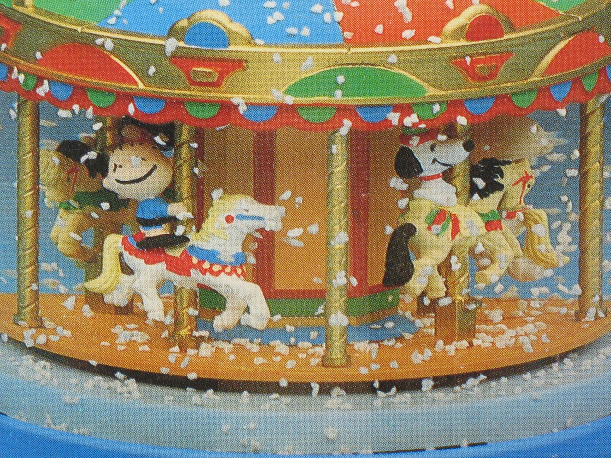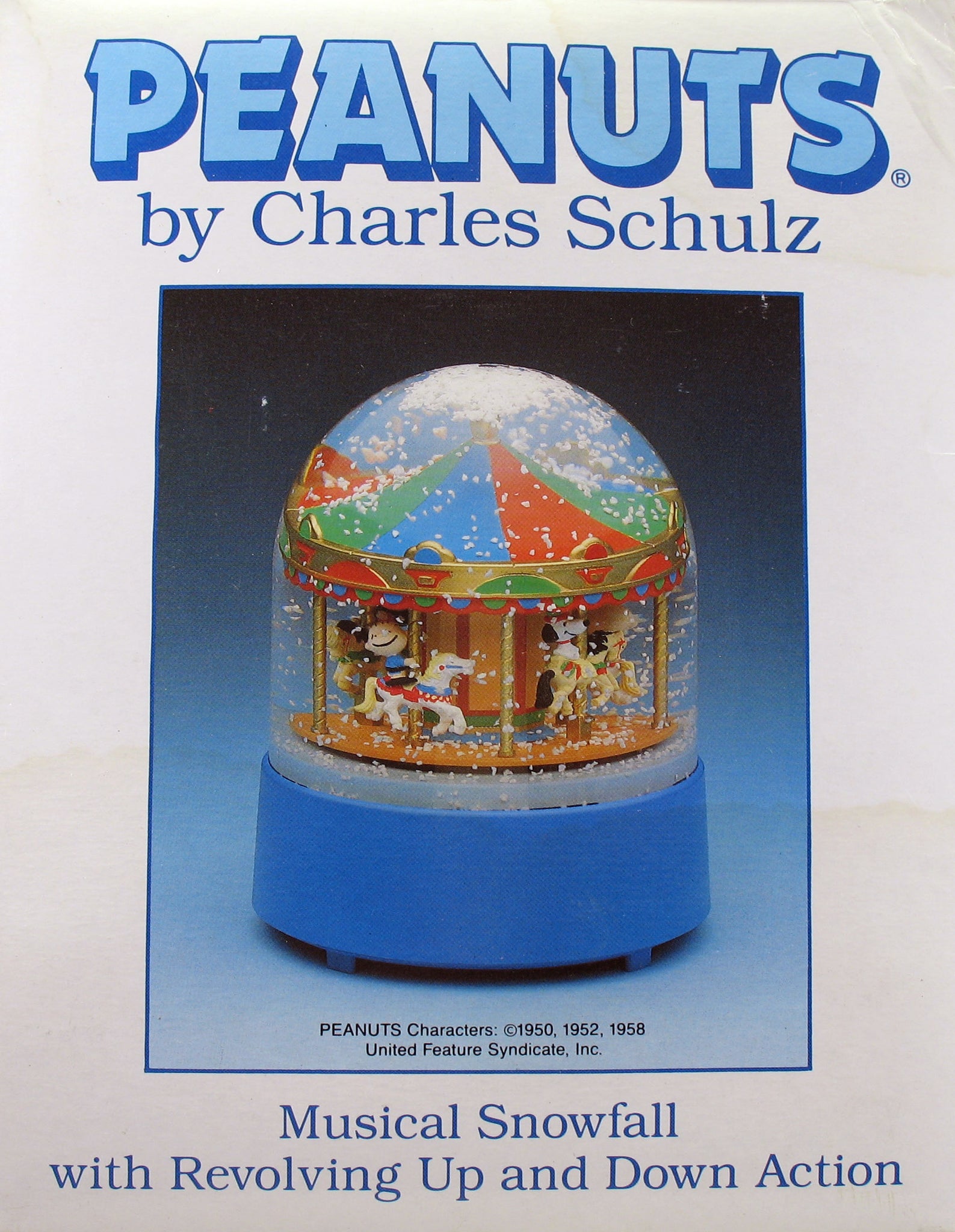 Charming Peanuts carousel revolving musical snow globe. Characters on horses that rise, lower and rotate around globe as "Carousel Waltz" tune plays. On/off switch on base for music. Measures 6" high x 4.75" diameter. NEW BUT NEAR MINT IN BOX (large air bubble; PLEASE NOTE: Charlie Brown and Lucy not attached to seat/floating in water; NO BOX)