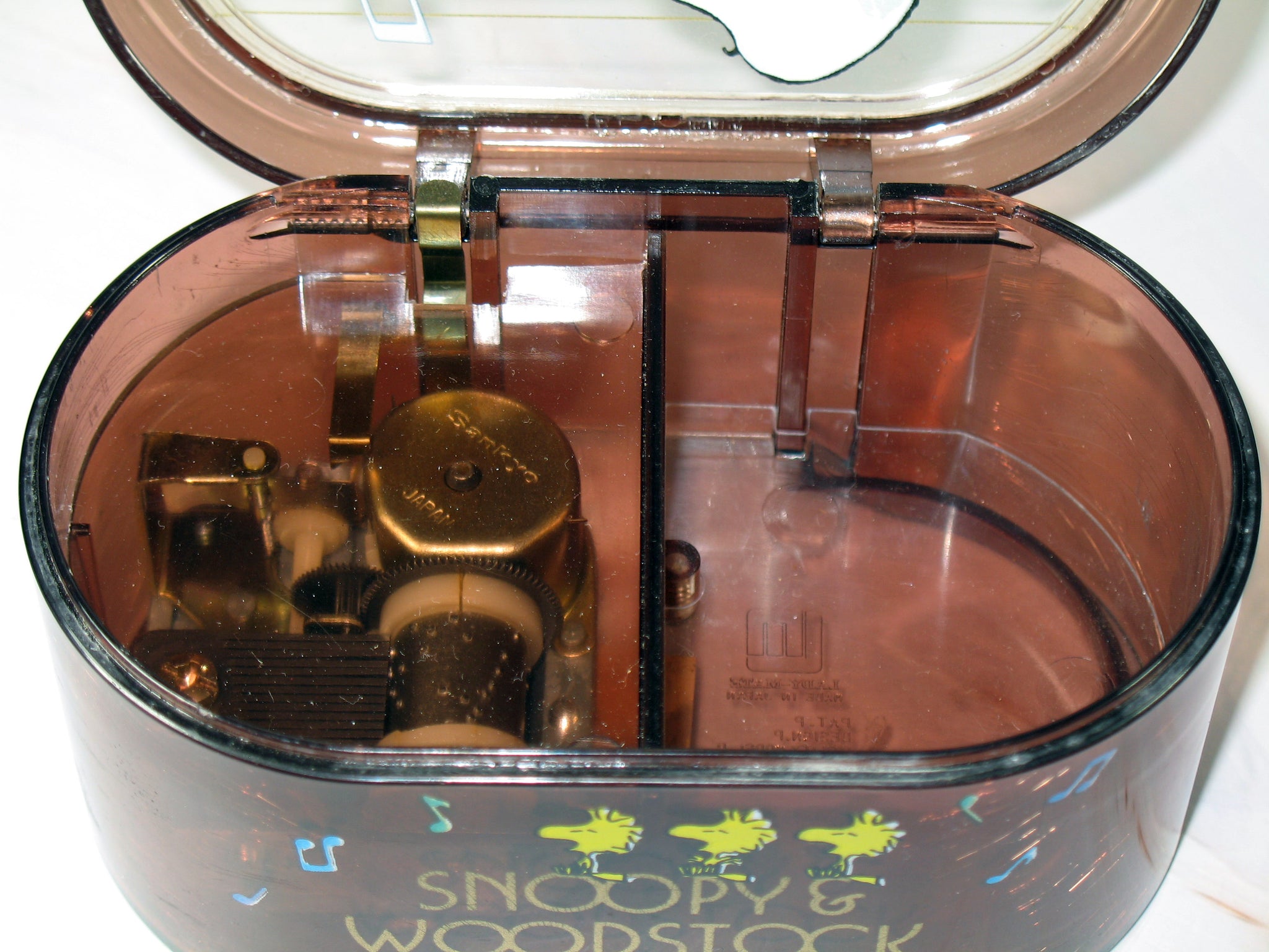 Snoopy Vintage Music / Trinket Box. Translucent brown in color. Plays "Yesterday" theme; turn key on bottom. Measures 4.5" x 2.5" x 2.75" deep - NEAR MINT (extremely light wear; small light scratch on bottom and on back; small area of old sticker adhesive on one side/can be removed; music plays slowly)
