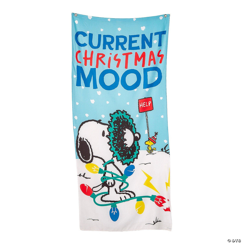 Every holiday celebration needs the goofy charm of beloved Peanuts® characters! This polyester door banner brings just that, with an illustration of Snoopy and Woodstock hilariously interacting with Christmas decor alongside the words "Current Christmas Mood." Hang this on your entryway to welcome guests in festive fashion. It makes the perfect decoration for office Christmas parties, community holiday events and family get-togethers. Includes grommets for hanging. Size: 27" x 60". Material: Polyester. NEW