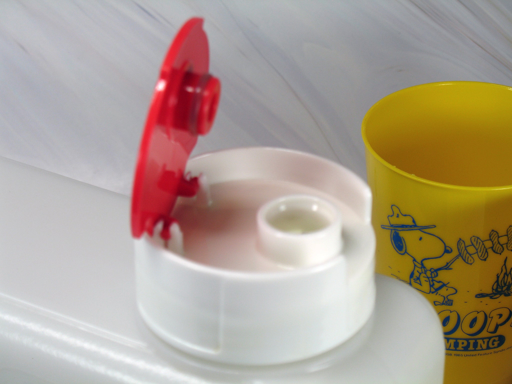 Made for Determined, this rare and extraordinary water bottle (container) made from thick, hard vinyl is the perfect addition to your camping gear and for traveling. The rugged container will hold your water or other beverage with the secure, screw-on lid with spout opening. Also includes molded side grips and 2 coordinating plastic cups. Container measures 11" wide x 4" high x 3" deep. Spout measures 1.25" high x 2.5 in diameter. Cups measure 3.75" high. NEW