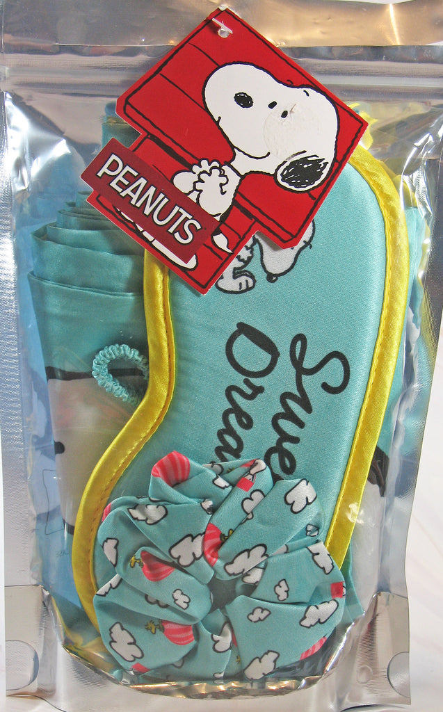 Snoopy 3-Piece Satin Sleepware Set. Includes standard size satin pillow case (20" x 30"), padded satin eye mask, and satin hair twister (scrunchie). NEW