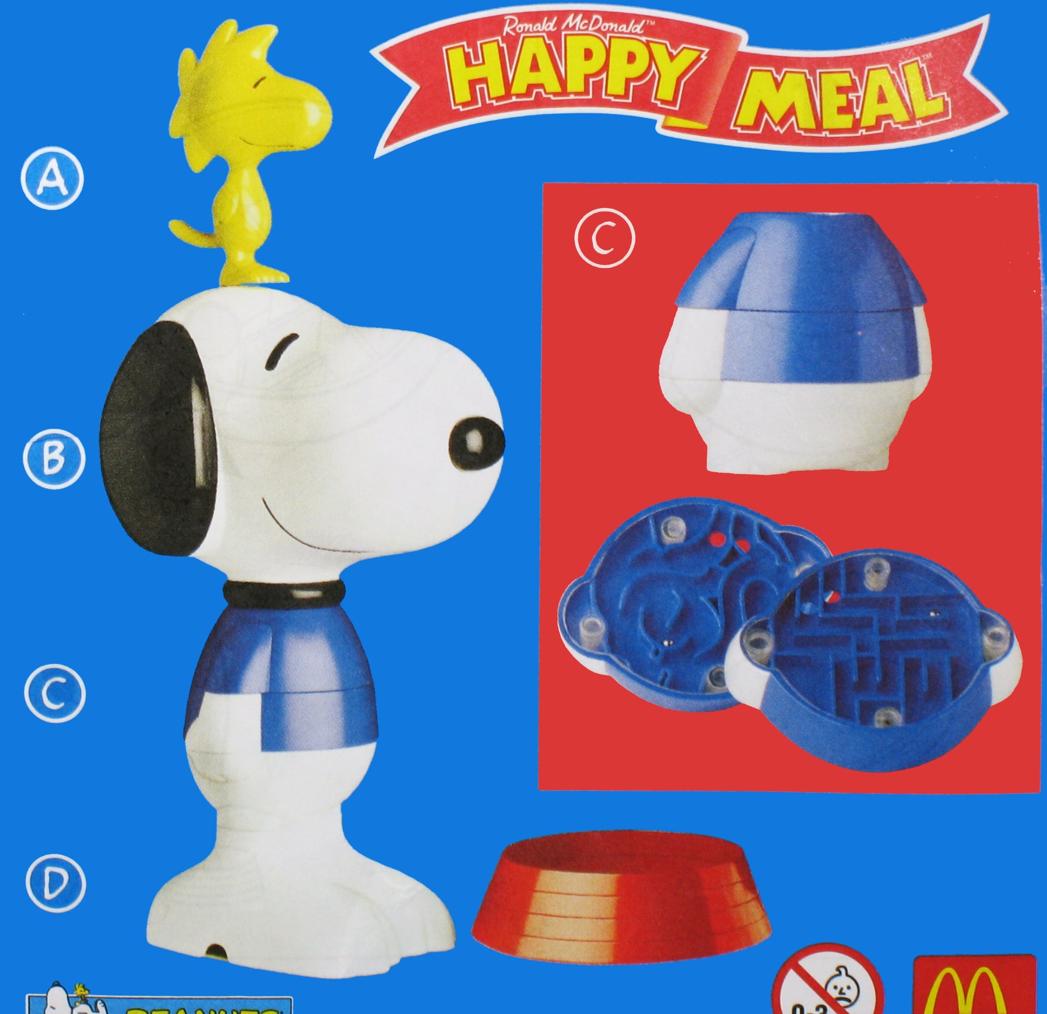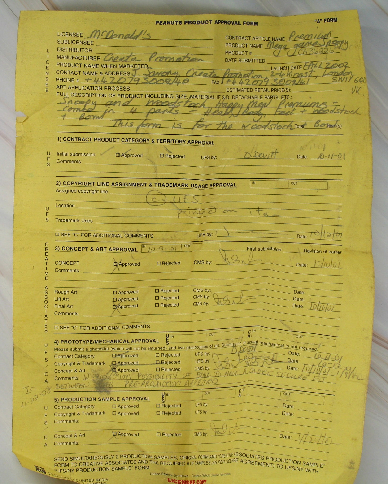 Very Rare 2001 Snoopy McDonald's Happy Meal Prototype Toy Set. Includes Original hand-written requisition/order form! Toys Made For McDonald's "Mega Game Snoopy" Promotion by Creata Promotion in UK. Includes 4 individual sets to make a full figure. Snoopy head is stationery and doesn't open, but other 3 sets includes multiple pieces to form individual games in each set. Middle body section separates into 2 sections containing mazes and a metal ball. Feet separate into 3 sections with game pieces. Dog dish opens to reveal plastic rings to throw over Woodstock's head when placed inside dish. Snoopy's large head measures 4" x 6. When fully constructed. Snoopy stands over 10" tall. NEW/Sealed Bags (Order form has numerous folds and one 1/8" long paper tear along edge)