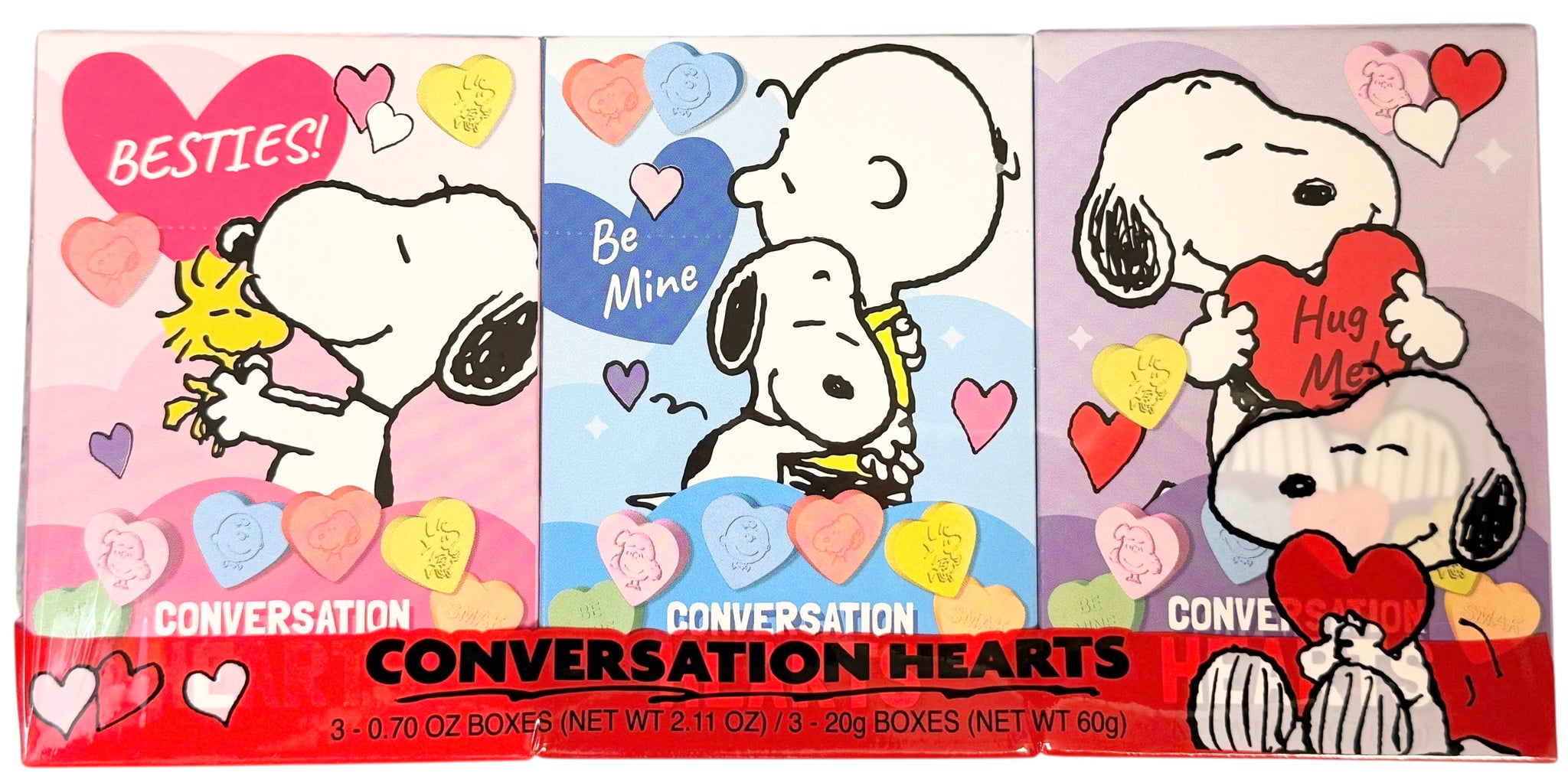 2026 Peanuts Valentine's Day Conversation Hearts Candy Set (3 boxes). Personalize (To/From space) on back. Net weight 2.11 oz. NEW
