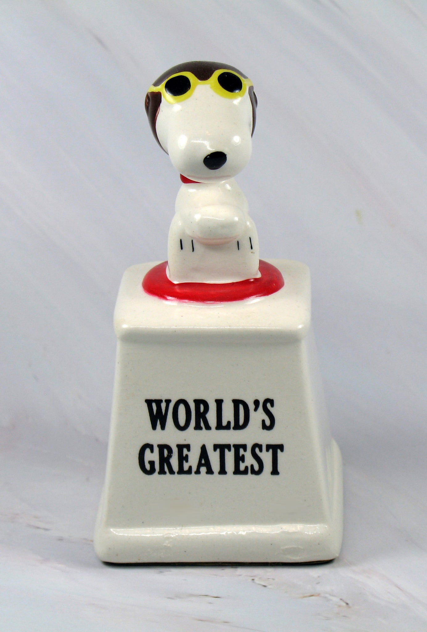 1980 Flying Ace Snoopy Vintage Ceramic Weighted Trophy. Can Also Be Used As A Paperweight. Felt covering on bottom to protect surfaces. Measures 4.25" high x 2" wide base. MINT