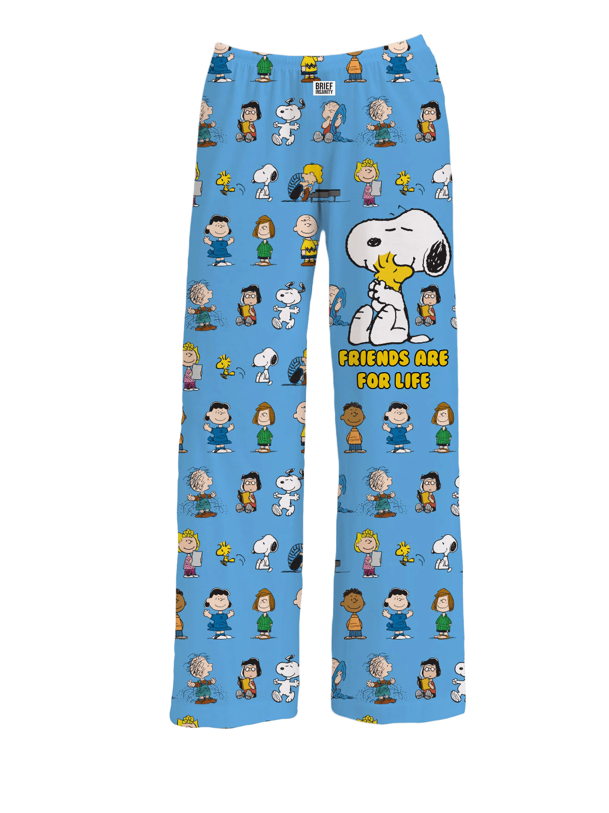 Peanuts Gang silky smooth lounge pants feature the iconic Peanuts characters displayed on a vibrant sky-blue background color. A fantastic gift for those people who love Peanuts and Snoopy.