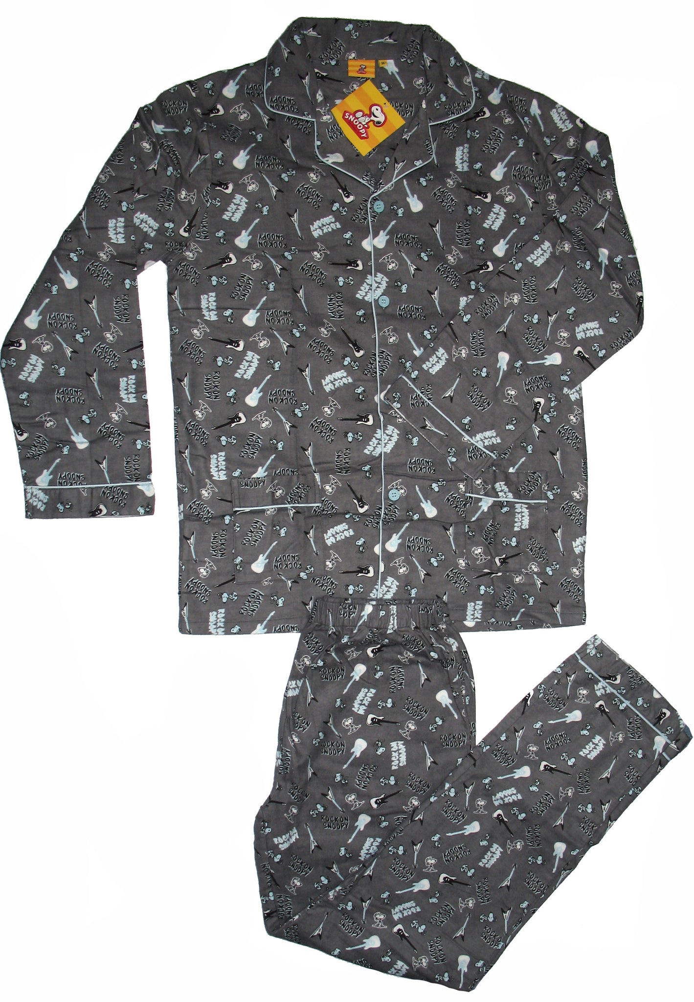 Imported unisex super soft flannel pajamas. Top includes attractive light blue piping along collar, down front, on pockets, as well as on wrist and ankle openings. In addition, top has a full length opening with 4 coordinating, light blue buttons and 2 lower pockets. Pants feature an elasticized waist, open ankles (not elasticized) and light blue piping at ankles. Size Medium but also go by measurements for proper fit: Top measures 32" long, 22" across chest, and 25" sleeve length from shoulder to wrist openings. Pants measure 42" long, 31" inseam, and 13" waist that can expand to 21". NEW