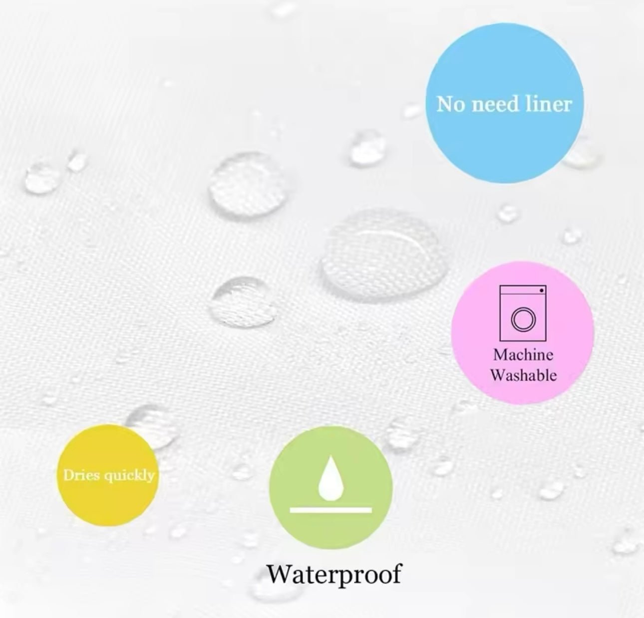 Made of waterproof 100% polyester fabric with metal ring rivets, this durable curtain will keep the water in the tub or stall where it belongs. Designed to fit standardized bath tubs. Measures 70"(w) x 70"(h). Machine wash cold. Do not bleach and hang to dry. Twelve plastic hanger rings included. NEW