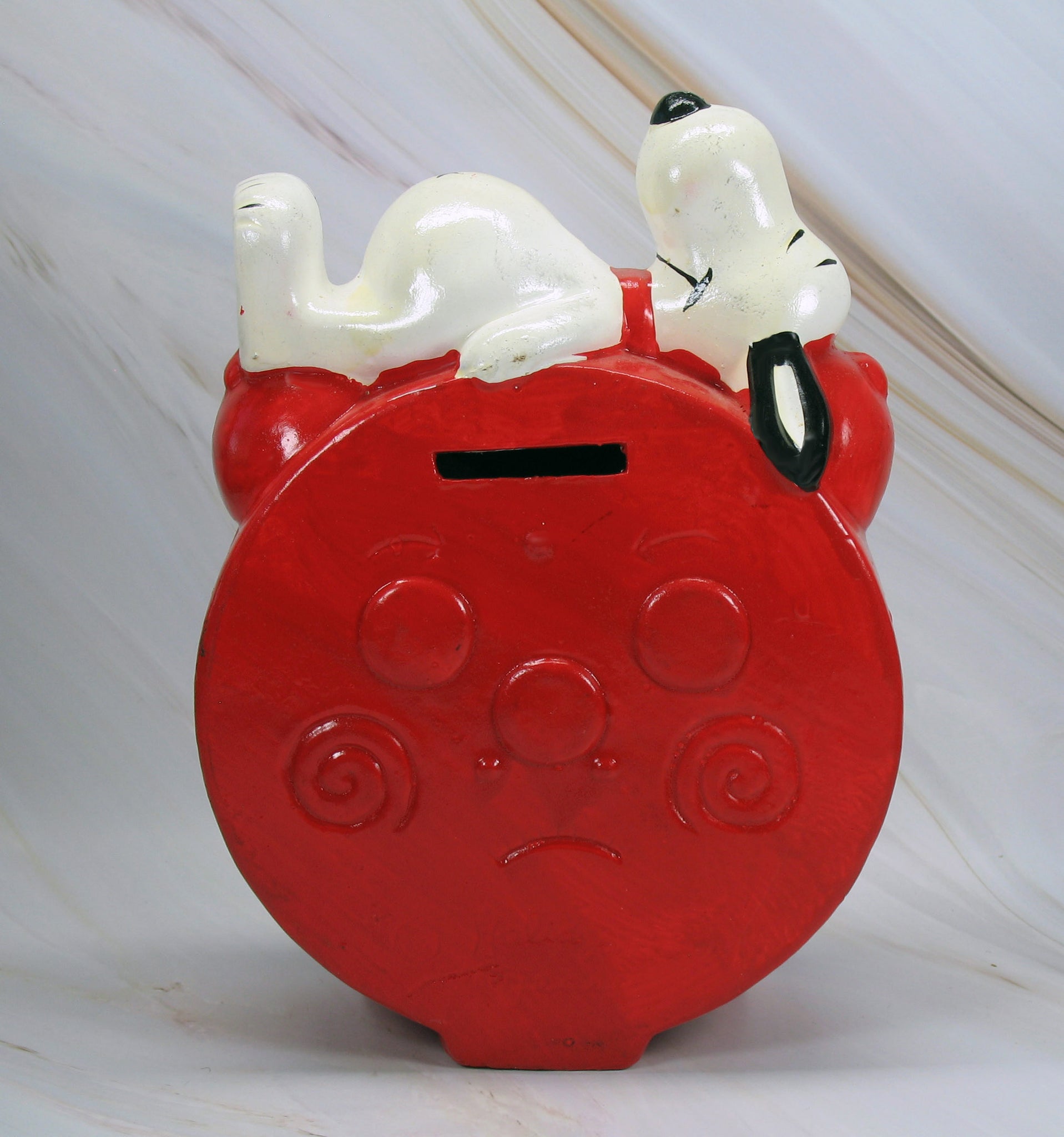 Vintage 1970's Holiday Fair Paper Mache Bank. Measures 5.25" x 7.25" x 2" deep - GOOD CONDITION (moderate wear to Snoopy and "Snooze Time" label. Glaze discolored on face of clock at upper areas)